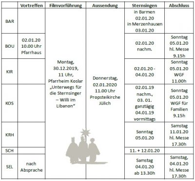 Die Sternsinger kommen! Um den 6.Januar herum sind in unseren Gemeinden wieder die Sternsinger unterwegs. Gemeinsamer Beginn der Aktion im Seelsorgebereich ist das Anschauen des Films„Unterwegs für die Sternsinger –Willi im Libanon“ am Montag, 30. Dezember 2019,um 11 Uhr im Koslarer Pfarrheim. Am Donnerstag, dem 2. Januar 2020,sind alle Sternsinger der Pfarrei um 11 Uhr in die Propsteikirche zum Aussendungsgottesdienst eingeladen, dem sich der gemeinsame Gang ins Rathaus zum Besuch des Bürgermeisters anschließt.