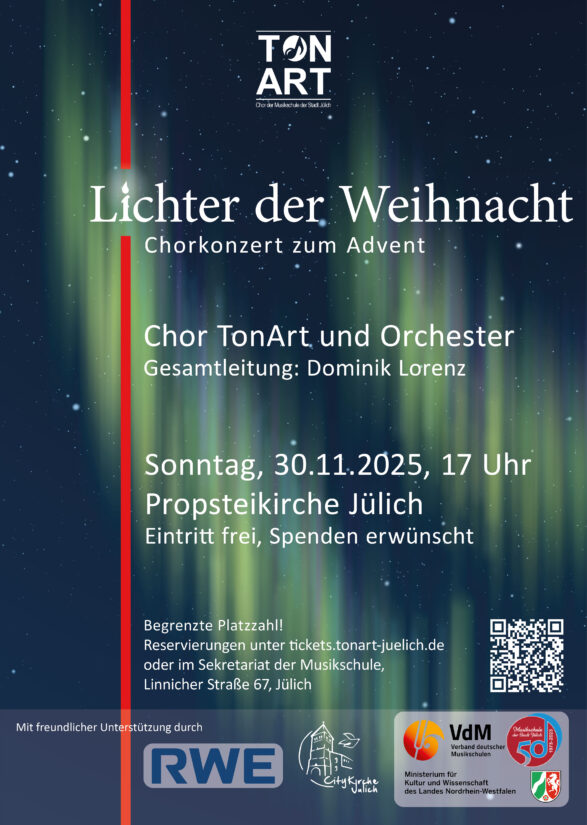 Sonntag, den 30. November 2025, um 17 Uhr lädt der Chor TonArt der Musikschule Jülich unter der Leitung von Dominik Lorenz zu seinem traditionellen Adventskonzert in die festlich illuminierte Propsteikirche ein. Begleitet von Instrumentalisten präsentiert der Chor ein abwechslungsreiches Programm, das einen stimmungsvollen Auftakt in die Adventszeit verspricht.