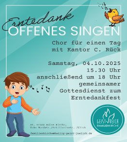 Am Erntedankfest starten wir um 15.30 Uhr – angeleitet von Kantor Christof Rück – zum fröhlichen Proben- und Singnachmittag, bei dem besonders Kinder herzlich willkommen sind. Gemeinsam üben wir Lieder ein, die wir anschließend um 18.00 Uhr im festlichen Familiengottesdienst präsentieren – ein Gottesdienst, zu dem natürlich auch alle Gemeindemitglieder eingeladen sind.
