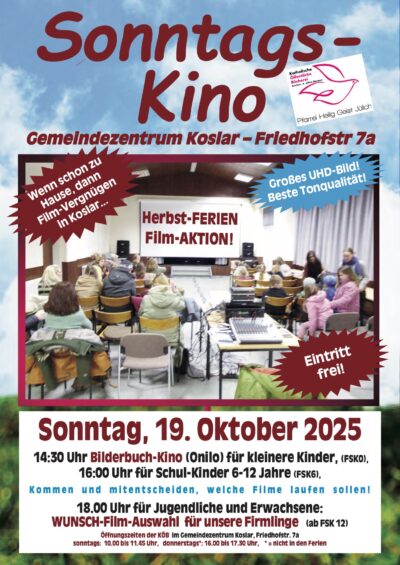 Die Katholische Öffentliche Bücherei Heilig Geist Jülich (KÖB) lädt herzlich zu ihrem Ferien-Sonntagskino am 19. Oktober 2025 ins Gemeindezentrum Koslar, Friedhofstr. 7a ein. Ein lichtstarker 4-K-Beamers zaubert auf unserer 4,70 x 3,50 Meter großen Leinwand eine vorzügliche Bildqualität. Zusammen mit dem Saal und hervorragender Ton-Technik entsteht hier echtes Kino-Feeling. Der Eintritt zu allen Filmen ist wie immer kostenlos.