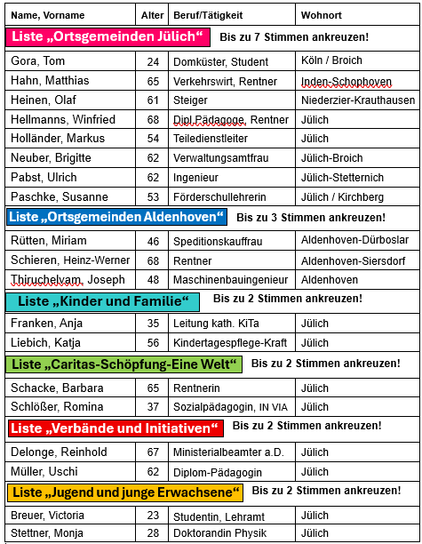 Der ganze Pastorale Raum Aldenhoven/Jülich gilt als ein Wahlbereich mit sechs Wahllisten, denen sich die Kandidierenden je nach Interesse zugeordnet haben.