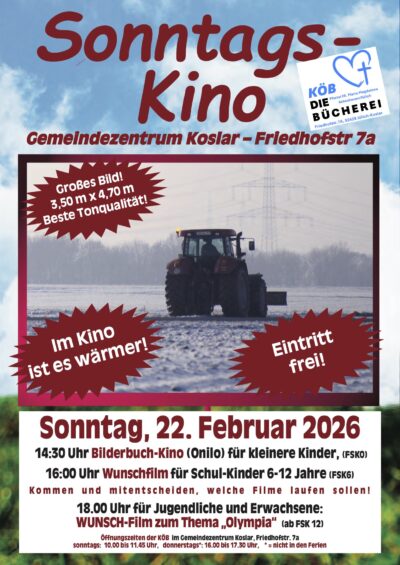 Die Katholische Öffentliche Bücherei Heilige Maria Magdalena Aldenhoven-Jülich (KÖB) lädt herzlich ein zu ihrem Sonntagskino am 22. Februar 2026 ins Gemeindezentrum Koslar, Friedhofstr. 7a.