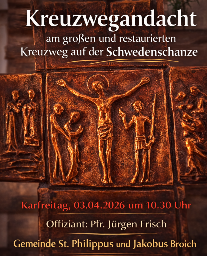 Am Karfreitag, 3. April 2026, lädt die Gemeinde St. Philippus und Jakobus Broich herzlich zur besonderen Kreuzweg-andacht auf der Schwedenschanze ein. Beginn ist um 10.30 Uhr am großen, restaurierten Broicher Kreuzweg.